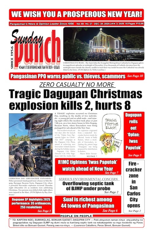 DAGUPAN FIRECRACKER BLAST — A makeshift firecracker factory exploded in Sitio Boquig, Barangay Bacayao Sur, Dagupan City on December 25, 2025, damaging a two-storey house where a large volume of firecrackers was being stockpiled. Responding to the incident were personnel from the Bureau of Fire Protection–Dagupan City, Panda Volunteer Fire…