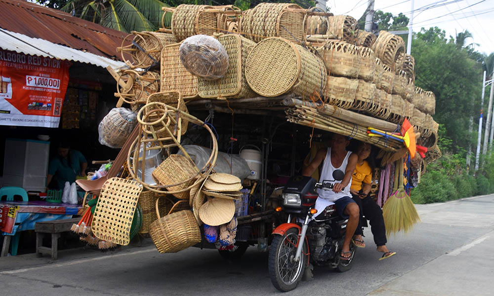 TRAVELING SALESMAN — A tricycle-riding entrepreneur peddles all sorts of bamboo and rattan handicrafts with some plastic household wares all stacked in and all around his sidecar as he traverses the Carmen-Poblacion Rosales National Road on September 12, 2025. (PUNCHphoto by Willie Lomibao)