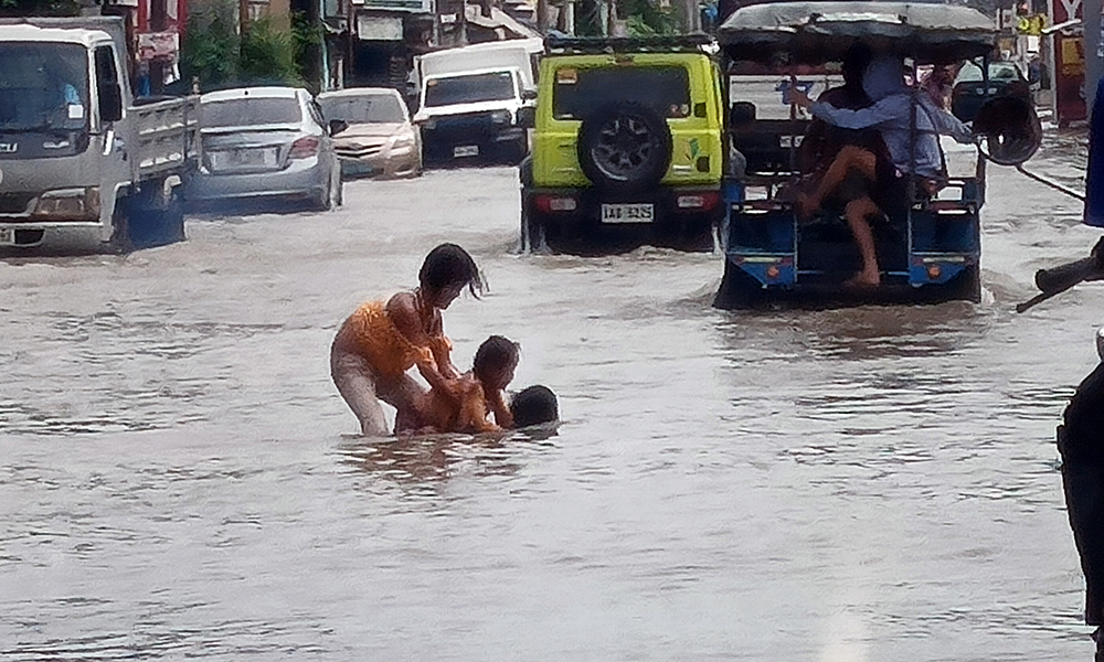 STREET SAFETY — Children play in flood water along the MacArthur Highway in Barangay Nalsian, Calasiao, amid vehicular traffic on October 9. The lingering flood is attributed to rains from recent typhoons, high tide, and the damaged dike at the Marusay River. (Punchphoto by Butch Uka)