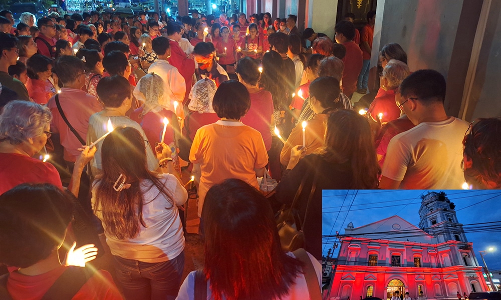 RED WEDNESDAY—Catholics pray as they light candles early Wednesday night (November 26) in front of the Epiphany of Our Lord Co-Cathedral Parish(inset) in Lingayen, which is illuminated in red in observance of Red Wednesday, a global day of prayers and remembrance for all the persecuted, oppressed and Christians in need around the world. (PUNCHphoto by Cesar Ramirez)